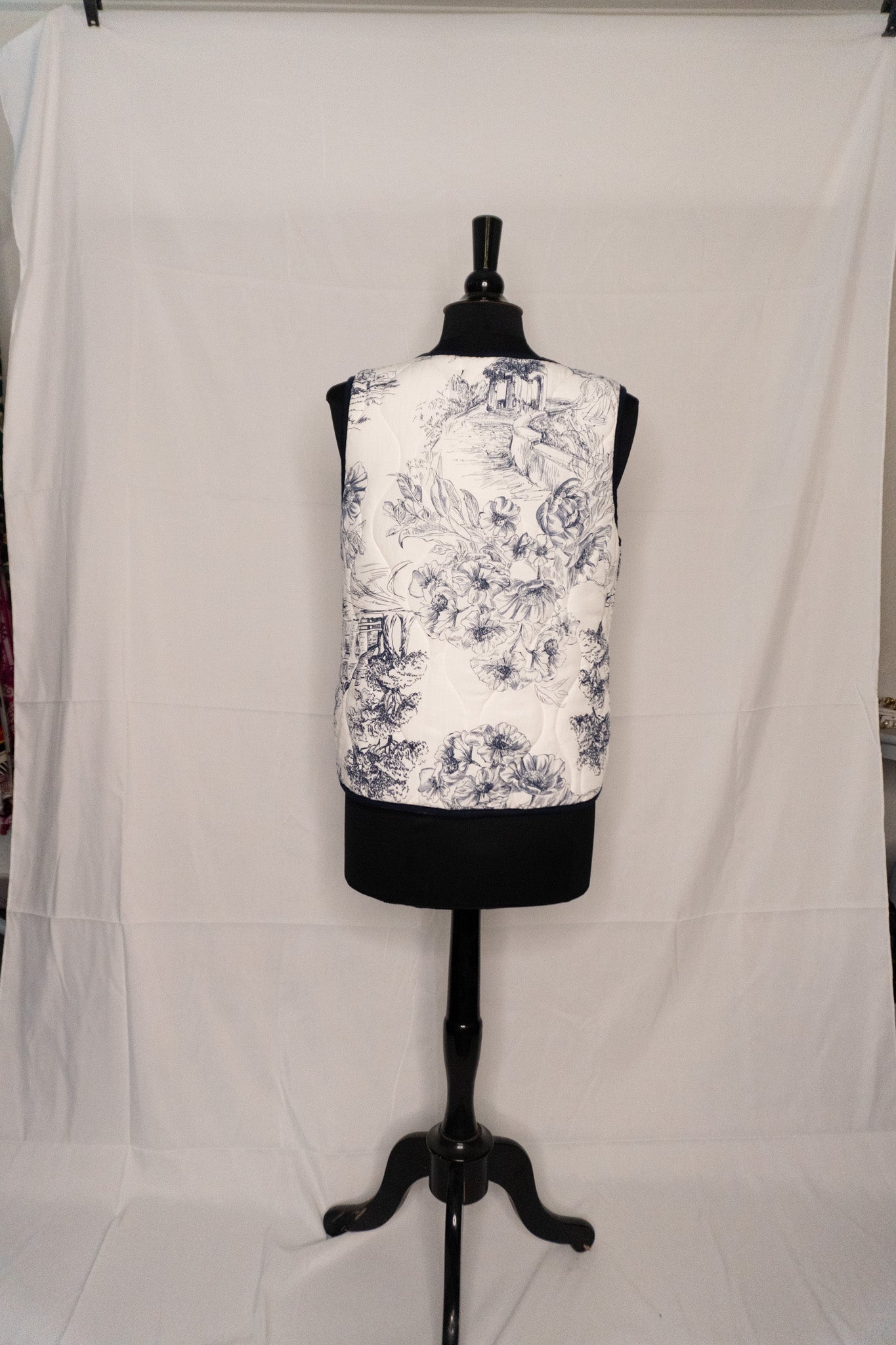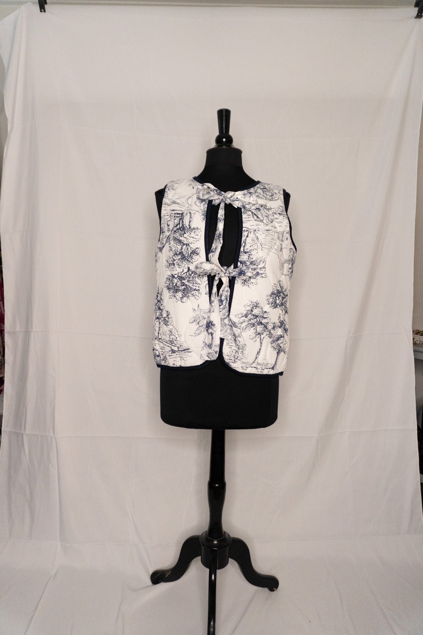 Ce gilet en toile de Jouy est la pièce parfaite pour ajouter une touche de charme à votre tenue. Fabriqué en viscose pour un confort inégalé, il présente un motif marine et blanc classique, idéal pour un look à la fois élégant et décontracté. Deux nœuds délicats à l'avant ajoutent une touche féminine et raffinée. Le gilet est ouatiné, offrant une chaleur légère tout en restant chic. À porter sur une blouse blanche ou un t-shirt basique, il rehaussera instantanément votre style.