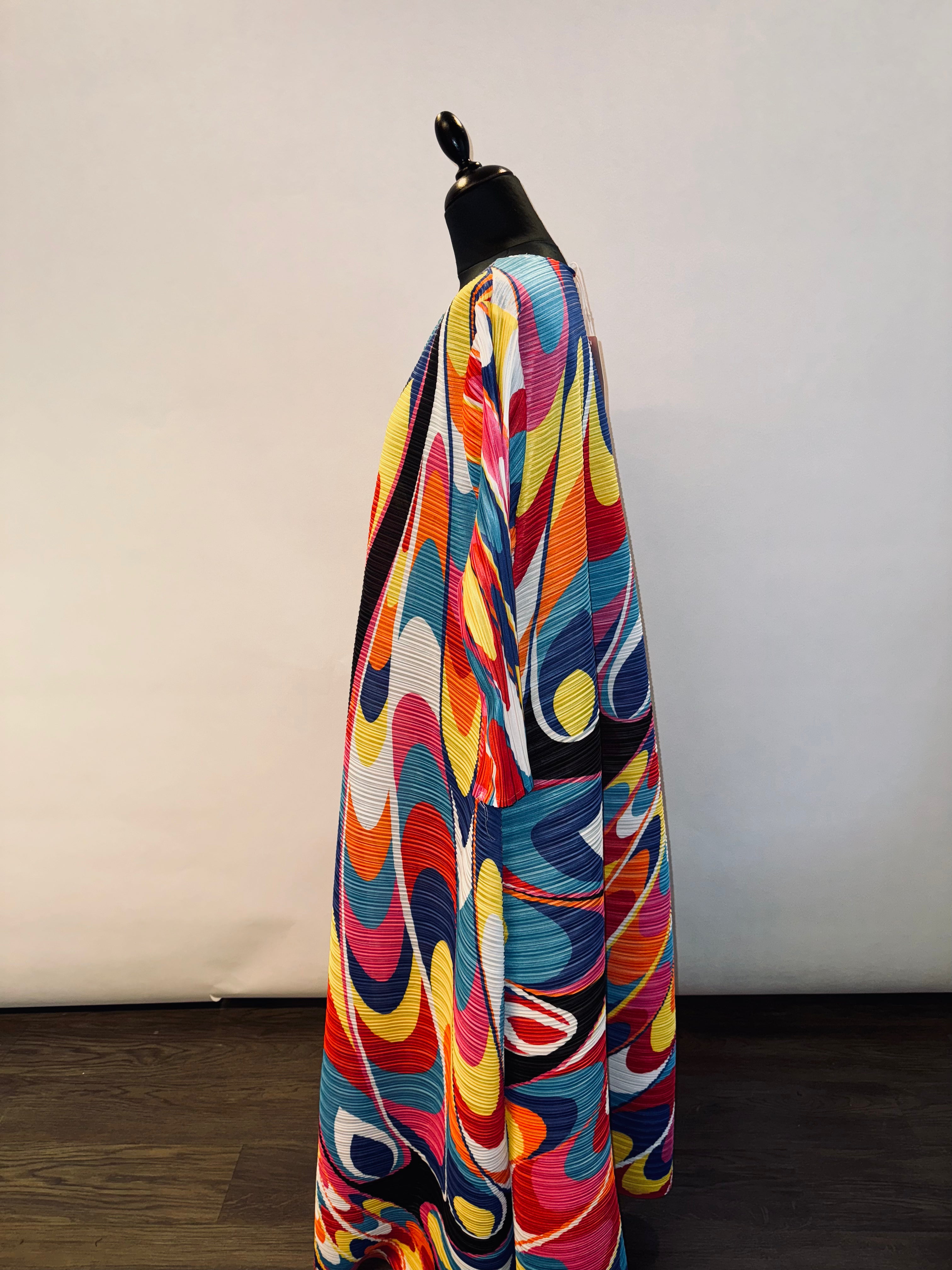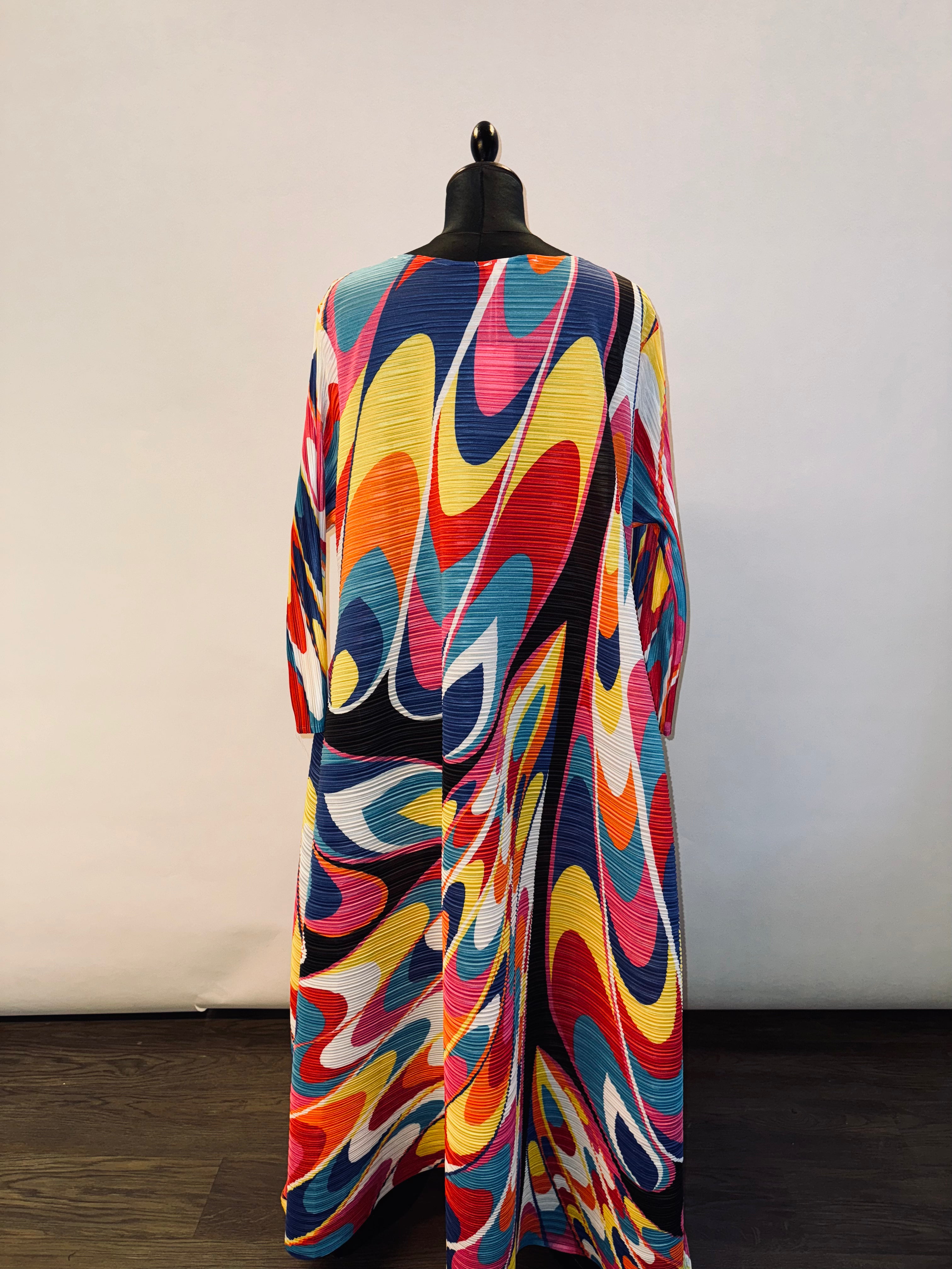 Cette robe tunique plissée aux multiples couleurs combine fluidité et élégance pour un style unique et audacieux, adapté à toutes les morphologies.