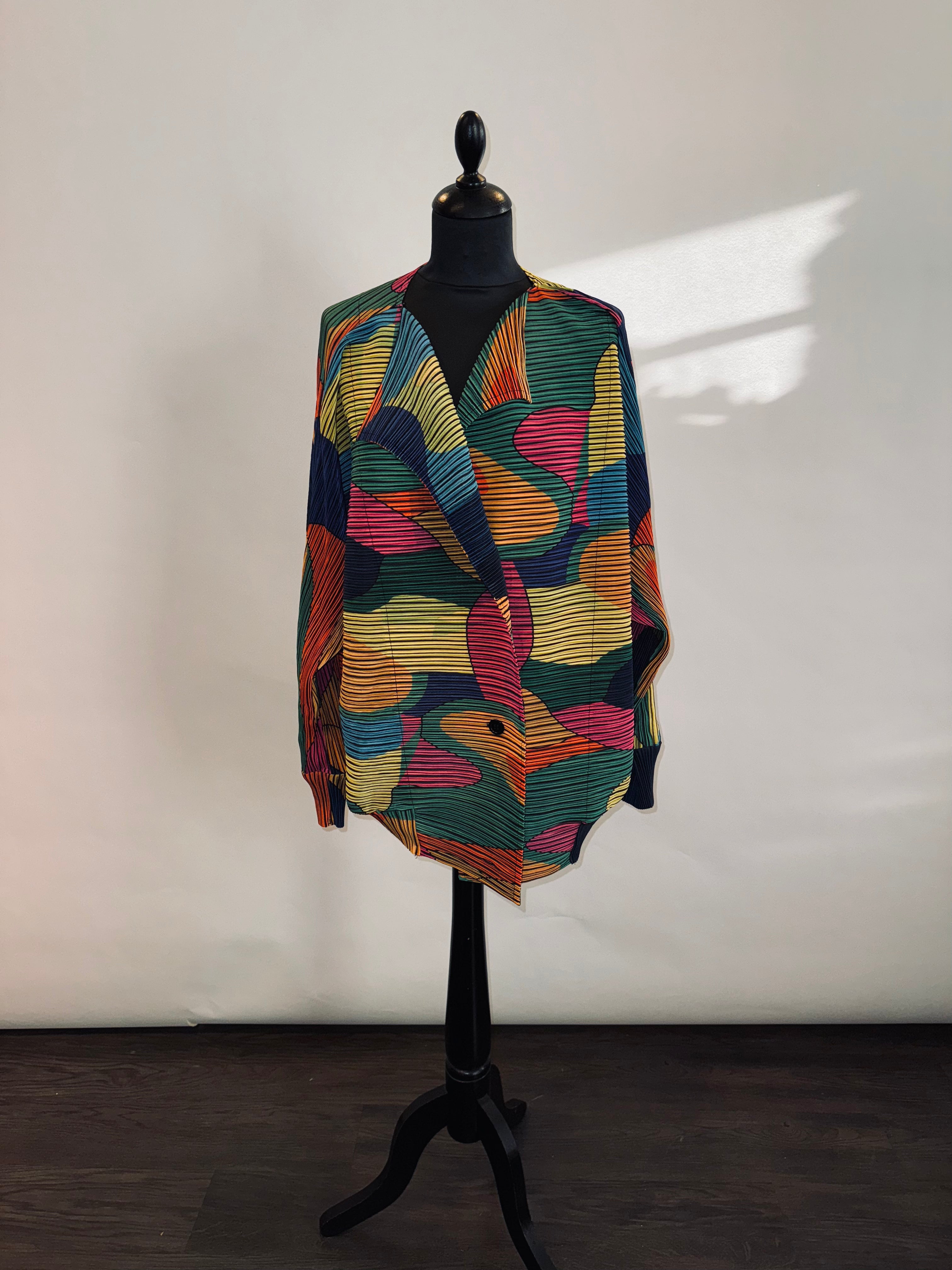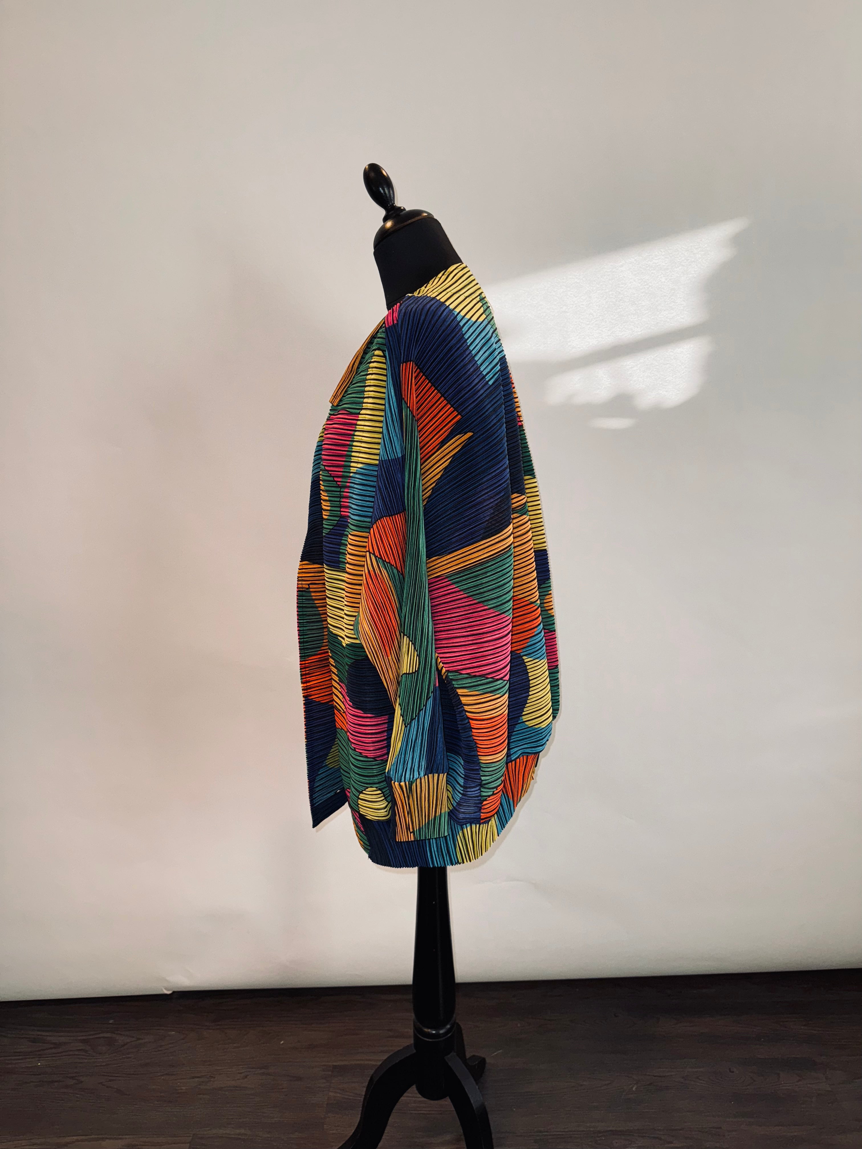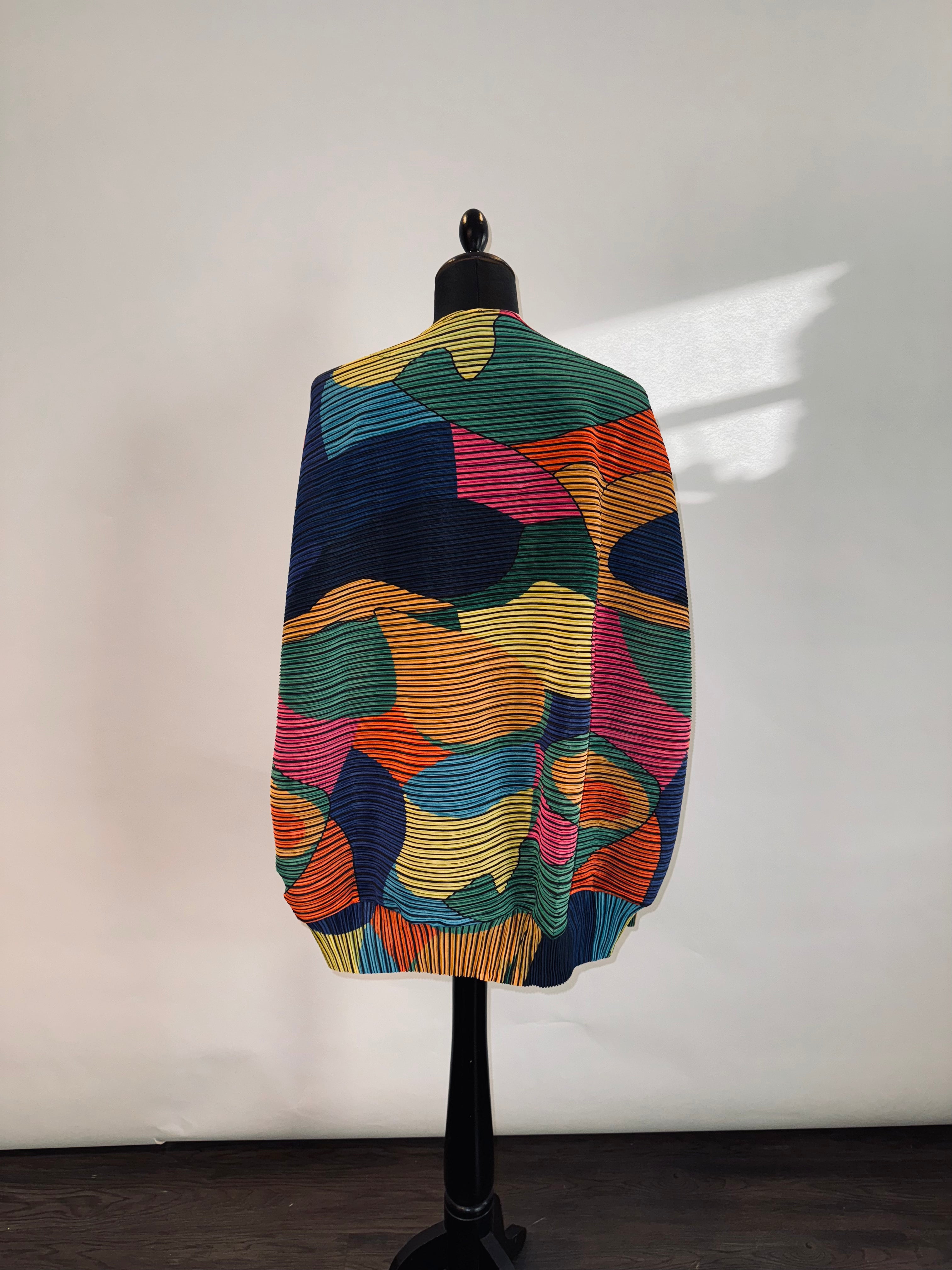 Ce chemisier plissé aux couleurs vibrantes (rose, orange, vert, bleu) en 100 % polyester avec une taille légèrement élastique combine légèreté, confort et fluidité pour s’adapter à toutes les morphologies.
